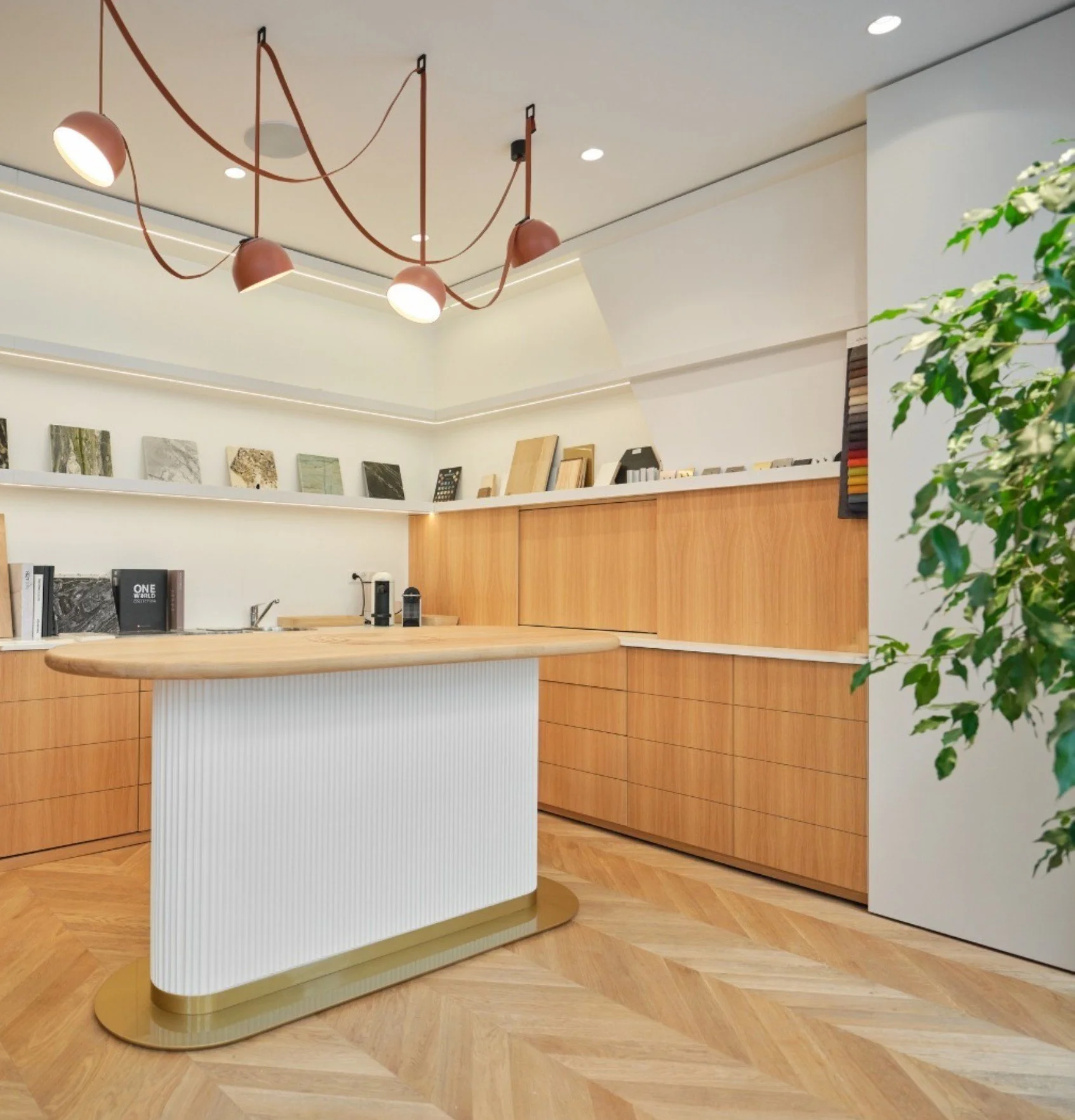 Dès l'entrée, le ton est donné par une hall d'accueil multifonctionnel, servant à la fois de matériauthèque et d'espace de consultation. Sur la droite, le regard est attiré par un premier bureau astucieusement dissimulé derrière une verrière arrondie, où un jeu de miroirs vient démultiplier les perspectives et la lumière. À l'arrière, l'espace ouvert dédié au coworking intègre des agencements sur mesure et un pod acoustique pour garantir la confidentialité des échanges.